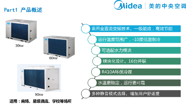 產(chǎn)品描述:熱泵型風(fēng)冷模塊機(jī)組是以空氣為冷熱源,水作為傳熱介質(zhì)的中央空調(diào)機(jī)組。該機(jī)組可與風(fēng)機(jī)盤管、空調(diào)箱等一起組成集 中式空氣調(diào)節(jié)系統(tǒng),實(shí)現(xiàn)夏季制冷、冬季采暖。美的G型風(fēng)冷模塊機(jī)組采用模塊化設(shè)計(jì).基準(zhǔn)模塊包括: 30kW、 65kW、 130kW, 模塊最多可并聯(lián)16臺(tái),形成30kW~1040kW范圍內(nèi)的組合產(chǎn)品。美的風(fēng)冷模塊機(jī)組廣泛適用于新建和改建的大小工業(yè)與民用建筑工程、對(duì)運(yùn)行噪音和周圍環(huán)境有較高要求、缺水或不便安裝冷卻塔的場(chǎng)所。特別適用于賓館、酒店餐廳、超市、商場(chǎng)、寫字樓、影劇院、廠房等各類建筑物。